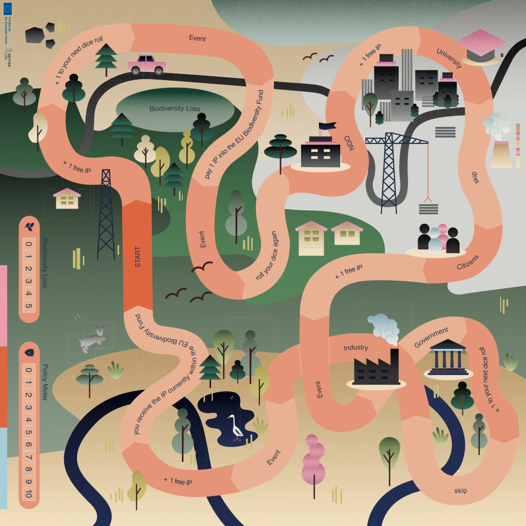 BETTER Life’s serious, educative boardgame allows participants to better understand the need for and advantages of collaboration amongst Quadruple Helix actors. The game focuses on teaching the importance of engaging science and cooperative initiatives to address and manage societal and environmental challenges. The players assume the role of a number of different organisational entities within the game scenario. Each player will have their own targets, while also striving to cooperate with other players to reach shared and communal goals. The goals within the game are aligned with the current EU Biodiversity Strategy 2030. Failure to reach goals will have negative consequences for all participants, but each player needs to finely balance how much of their in-game resources are allocated towards their own agenda and how much they want to contribute to common targets.